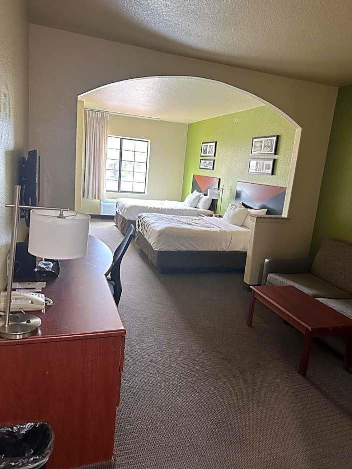Spacious suite features a seating area with a sofa bed. It includes a flat-screen TV, a microwave, fridge and coffee maker.